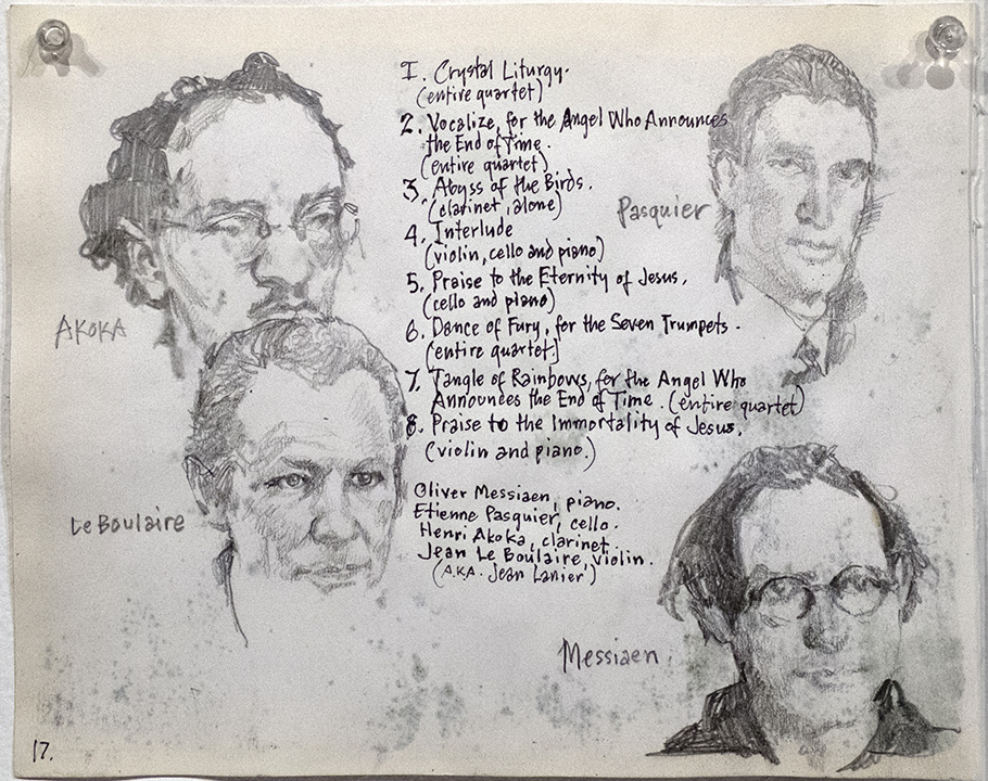 The "Quartet" was literally forged in captivity. Stripped of his clothes but clutching a bag of miniature scores, Messiaen found three other professional musicians among the prisoners: clarinetist Henri Akoka (aged 28), violinist Jean le Boulaire (aged 27), and cellist Étienne Pasquier (aged 35).